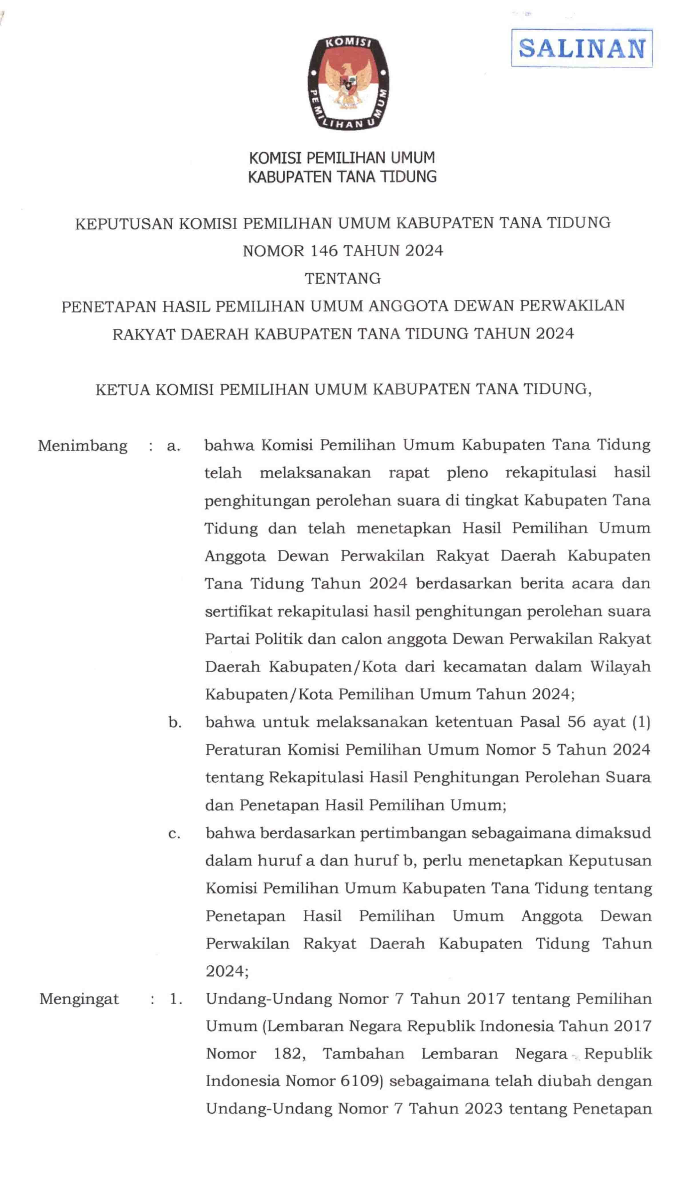 Keputusan Komisi Pemilihan Umum Kabupaten Tana Tidung Nomor 146 Tahun 2024 Tentang Hasil Pemilihan Umum Anggota Dewan Perwakilan Rakyat Daerah Kabupaten Tana Tidung Tahun 2024 Minggu, 25 Februari 2024 09:43 647 KLIK GAMBAR UNDUH ? Bagikan: Telah dilihat 647 kali