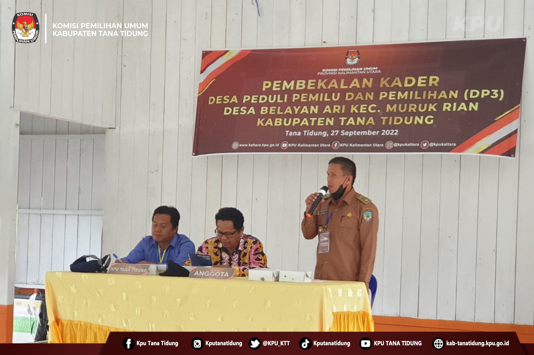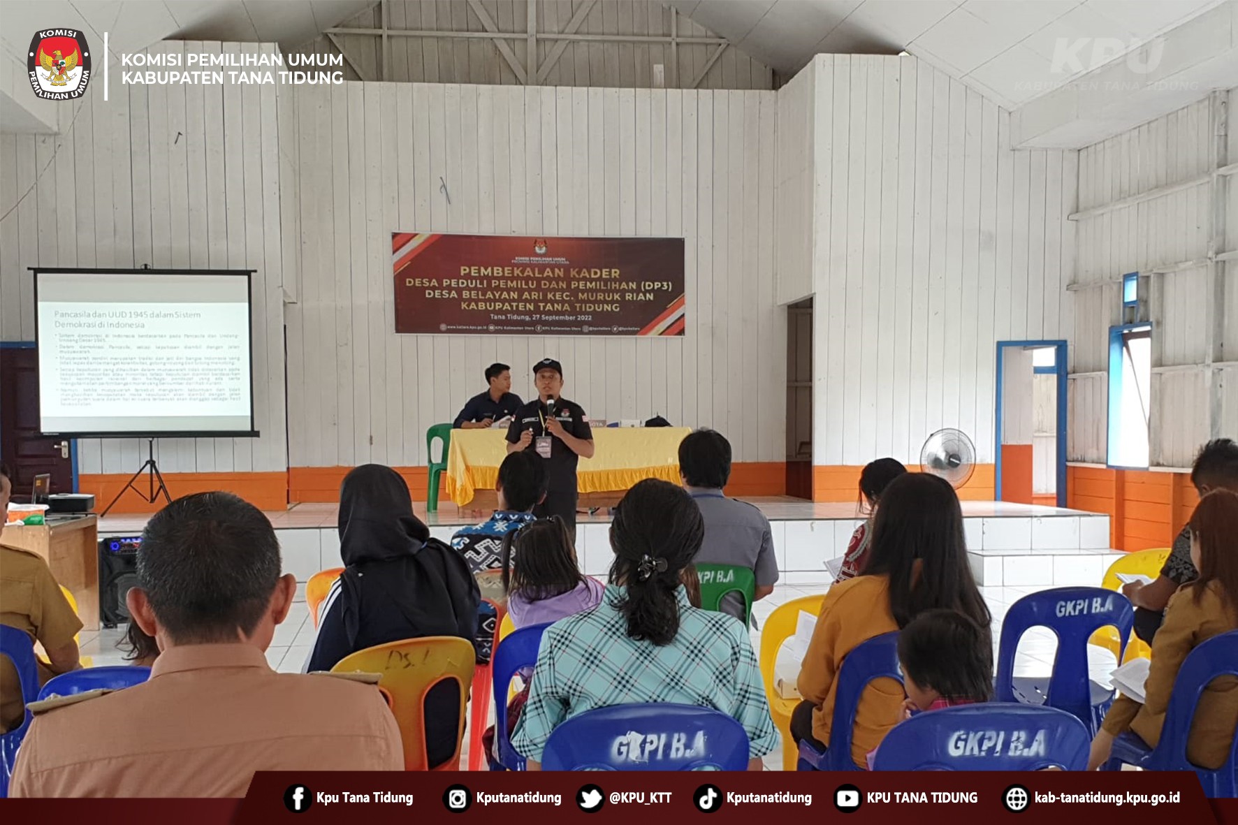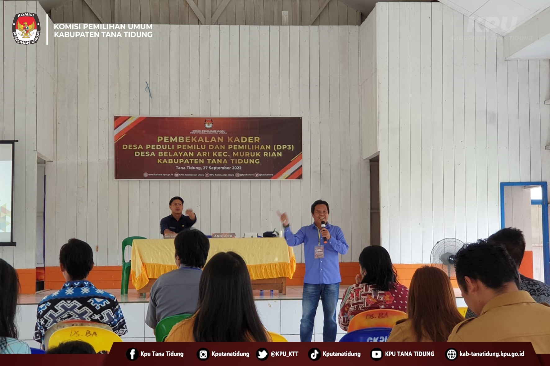 Hai #TemanPemilih Anggota KPU Kabupaten Tana Tidung Hermansyah, Apriadi dan Bambang Priyo Noegroho menjadi Fasilitator dalam Pembekalan Kader progam Desa Peduli Pemilu dan Pemilihan (DP3) pada Selasa, 27 September 2022 bertempat di Kantor Desa Belayan Ari.