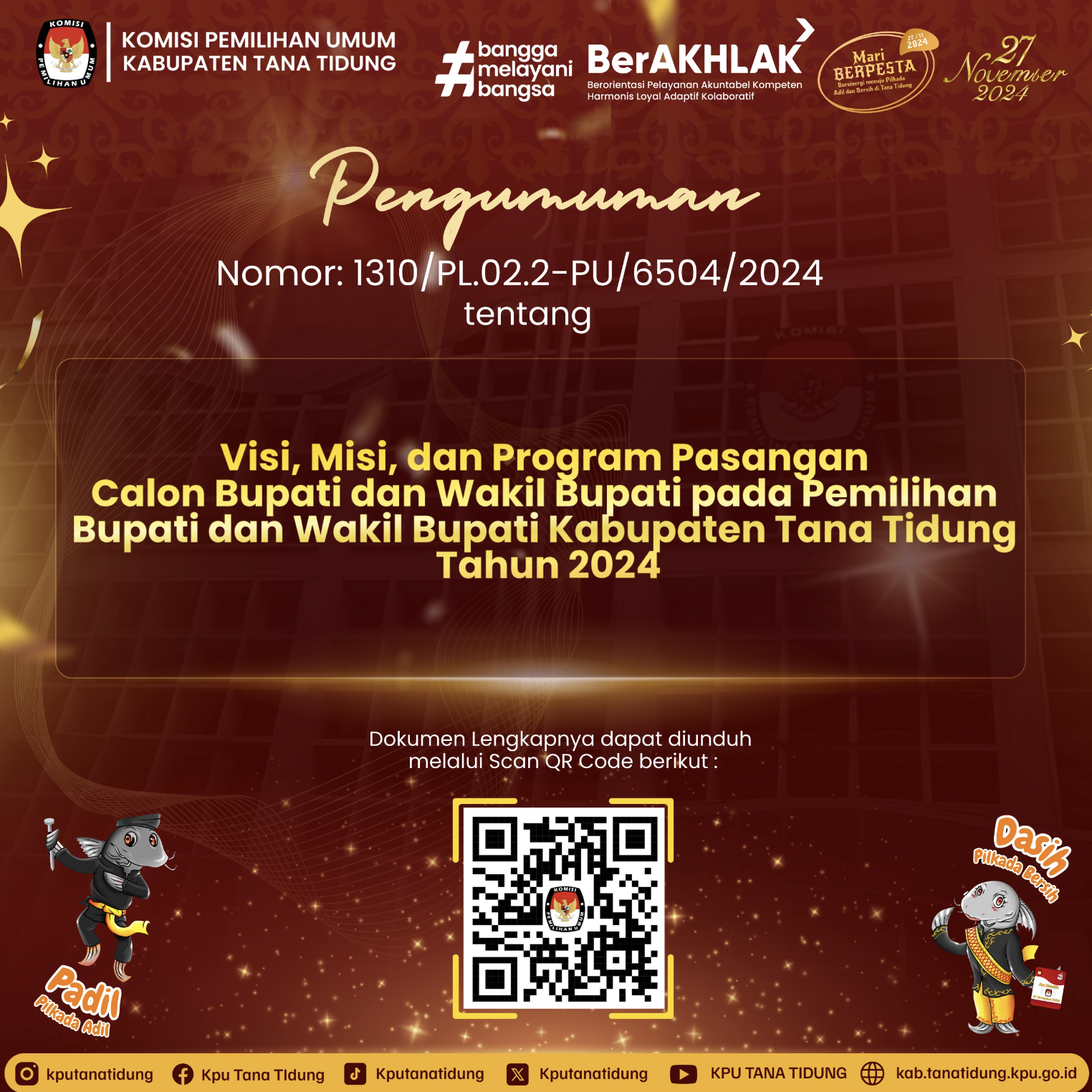 Berikut kami sampaikan Pengumuman Nomor 1310/PL.02.2-PU/6504/2024 tentang Visi, Misi, dan Program Pasangan Calon Bupati dan Wakil Bupati pada Pemilihan Bupati dan Wakil Bupati Kabupaten Tana Tidung Tahun 2024. Untuk Dokumen Lengkapnya dapat diunduh melalui Scan QR Code yang tertera pada postingan ini.
