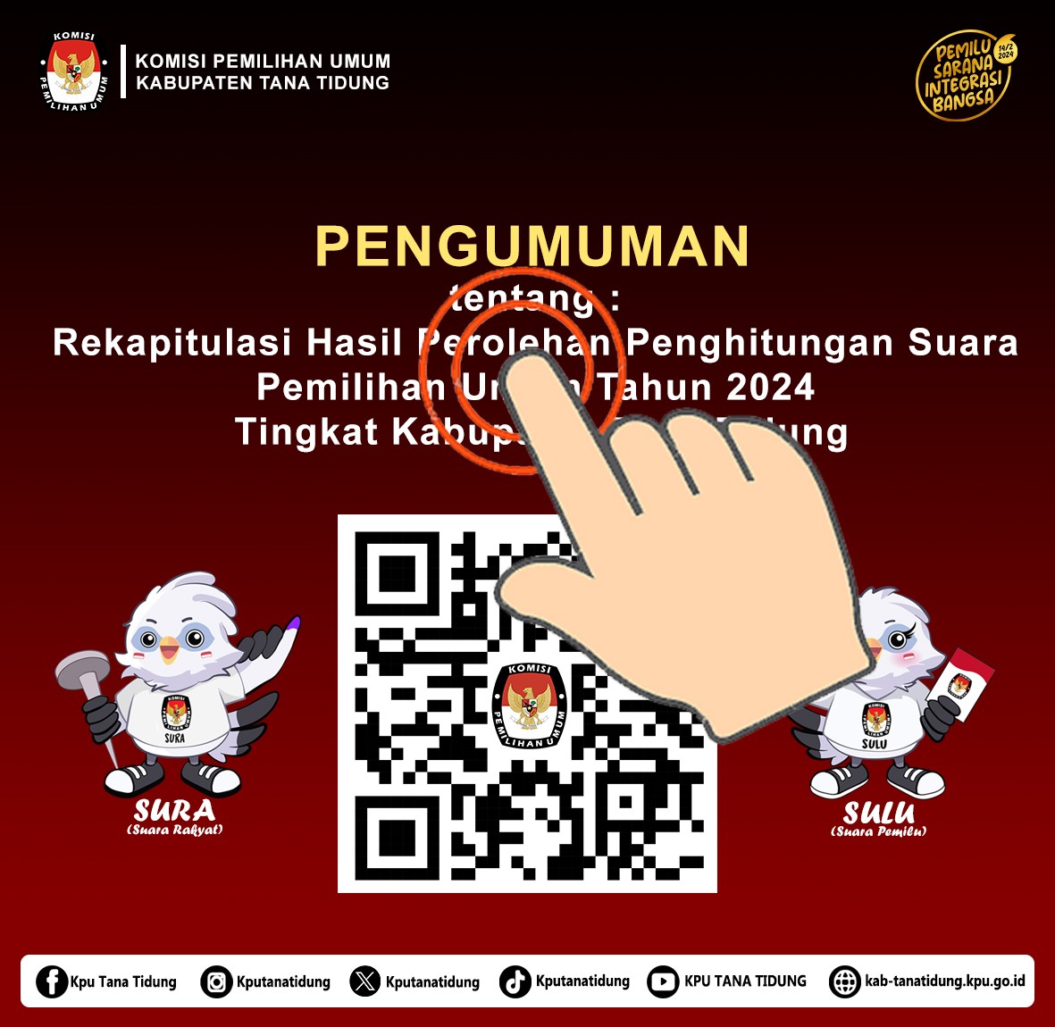 PENGUMUMAN tentang : Rekapitulasi Hasil Perolehan Penghitungan Suara Pemilihan Umum Tahun 2024 Tingkat Kabupaten Tana Tidung Senin, 26 Februari 2024 11:56 590 KLIK GAMBAR ? Bagikan: Telah dilihat 590 kali