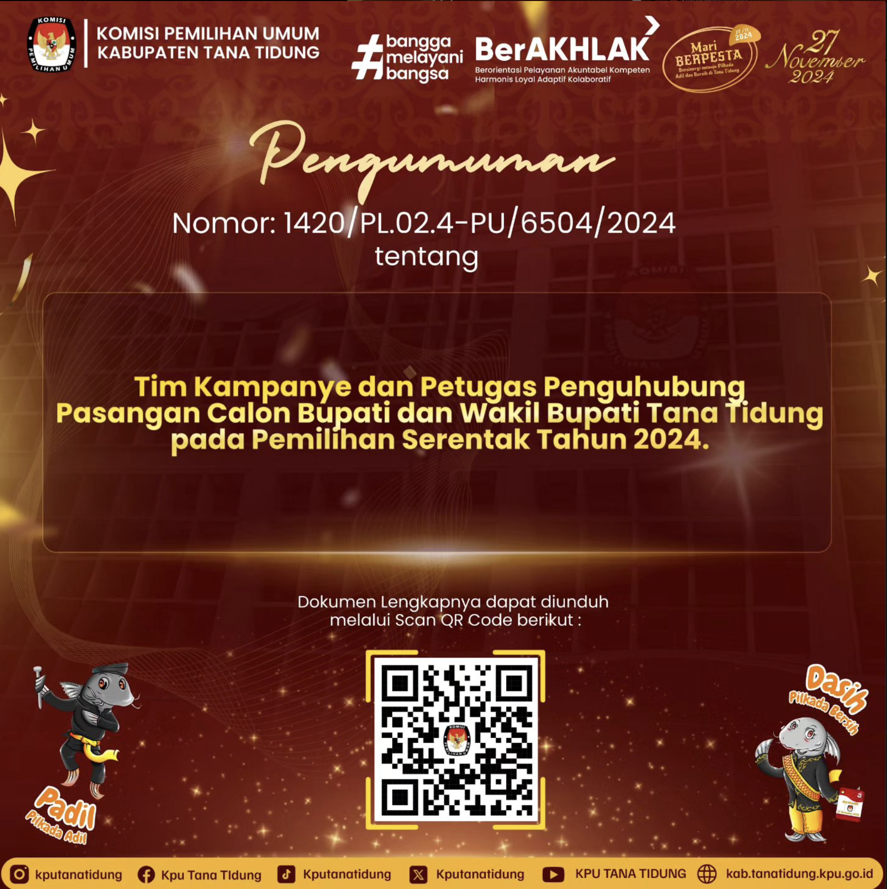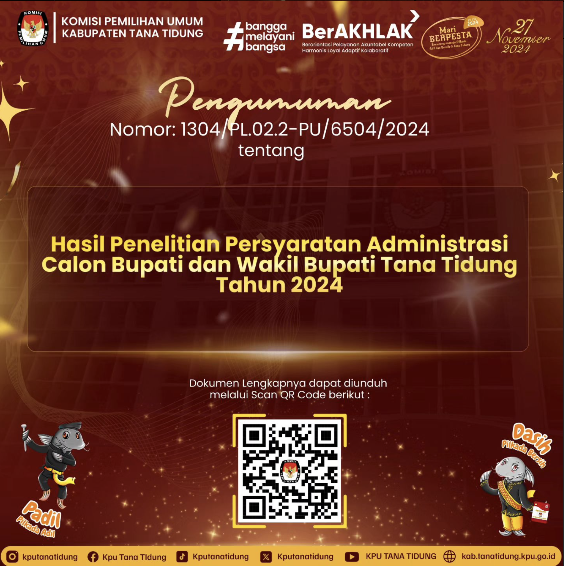 Mari kita sukseskan Pemilihan Bupati dan Wakil Bupati Tana Tidung Tahun 2024 dengan semangat kebersamaan, keterbukaan, dan demokrasi yang sehat.
