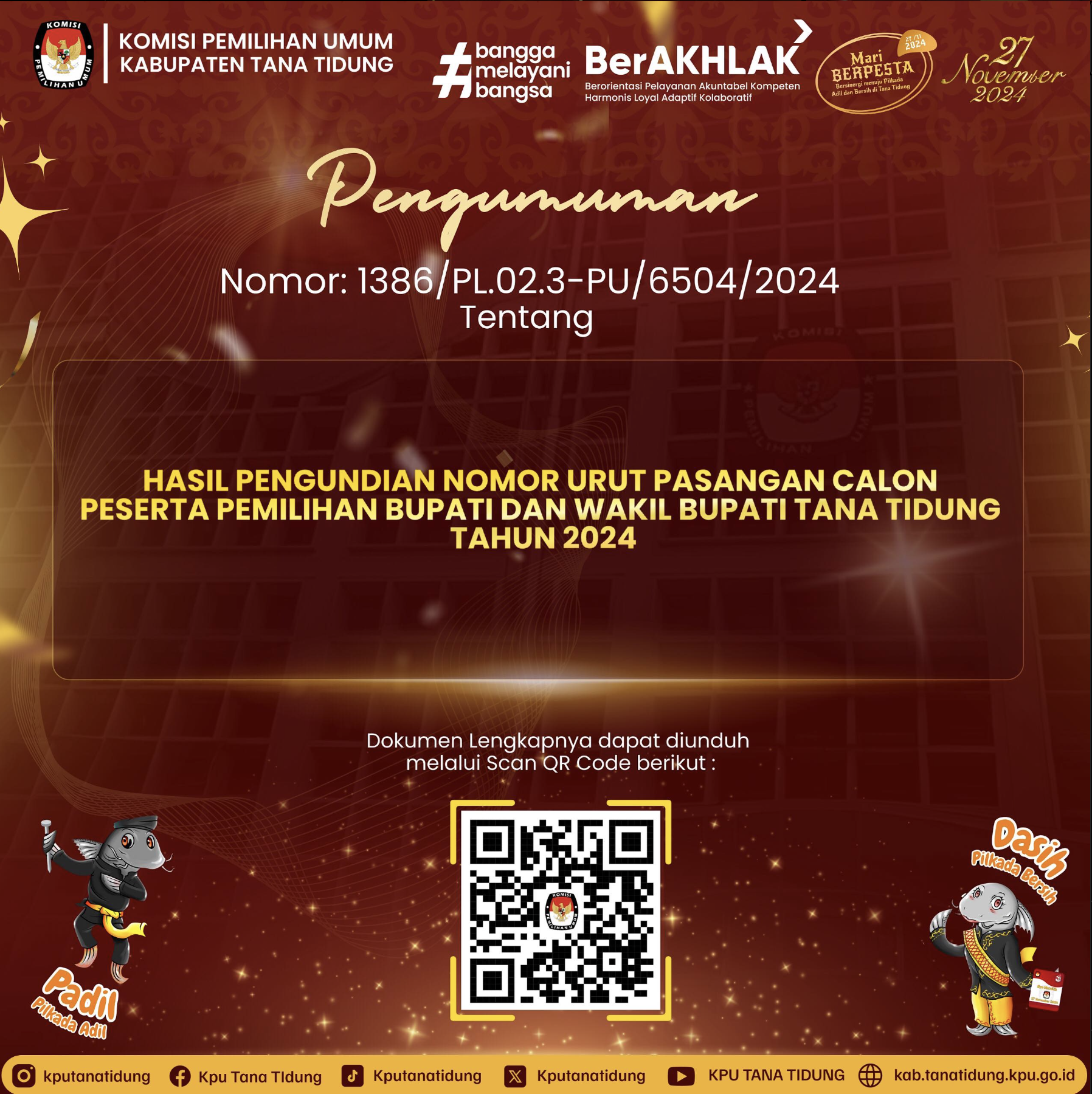 Untuk informasi lebih lanjut mengenai pasangan calon yang telah ditetapkan, masyarakat dapat mengakses laman resmi KPU Kabupaten Tana Tidung atau mengikuti informasi terbaru melalui kanal media sosial KPU.