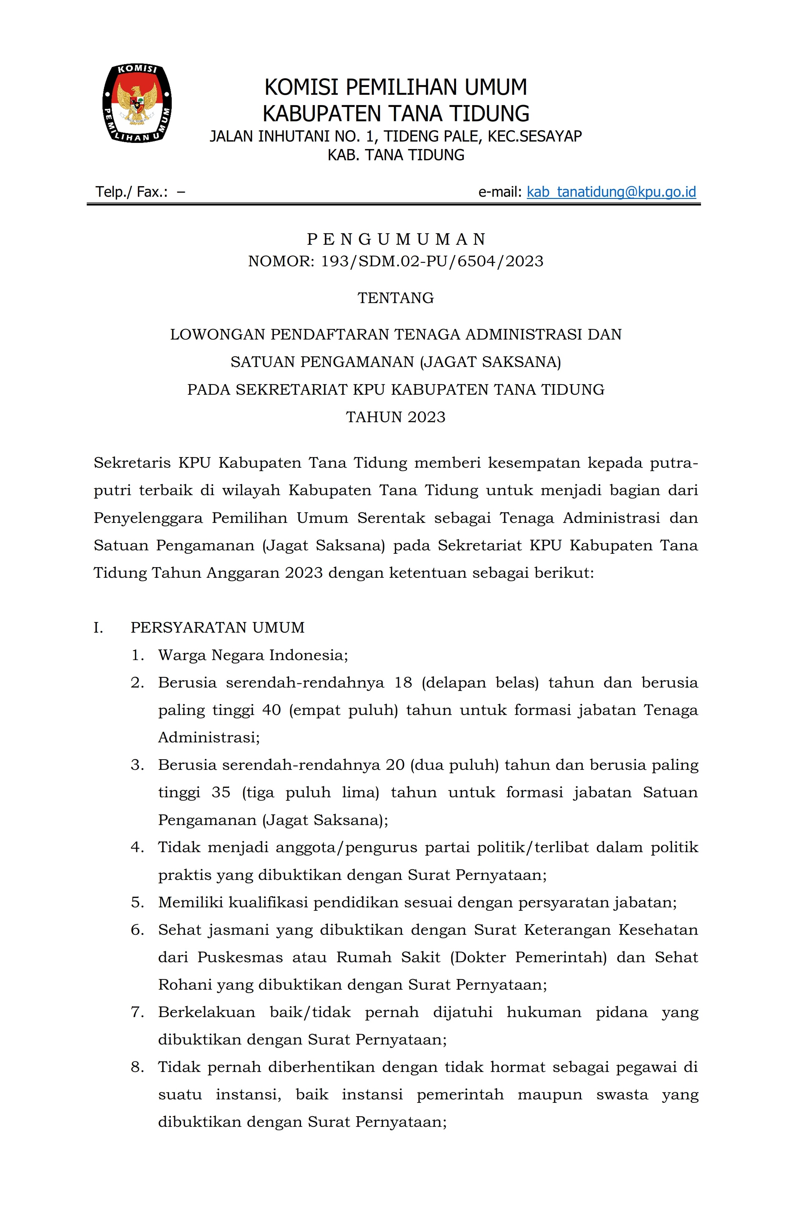 LOWONGAN PENDAFTARAN TENAGA ADMINISTRASI DAN SATUAN PENGAMANAN (JAGAT SAKSANA) PADA SEKRETARIAT KPU KABUPATEN TANA TIDUNG TAHUN 2023 Senin, 13 Februari 2023 16:00 628 DOWNLOAD PENGUMUMAN_2023PU193.pdf DOWNLOAD FORMAT SURAT LAMARAN SELEKSI 2023.pdf DOWNLOAD FORMAT SURAT PERNYATAAN.pdf DOWNLOAD FORMAT DAFTAR RIWAYAT HIDUP.pdf Baca Selengkapnya