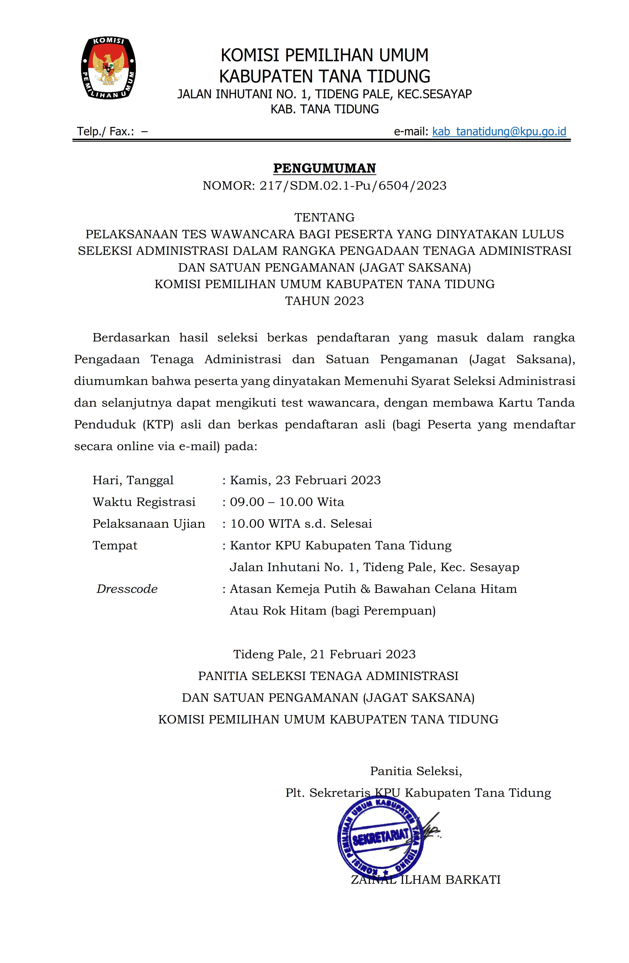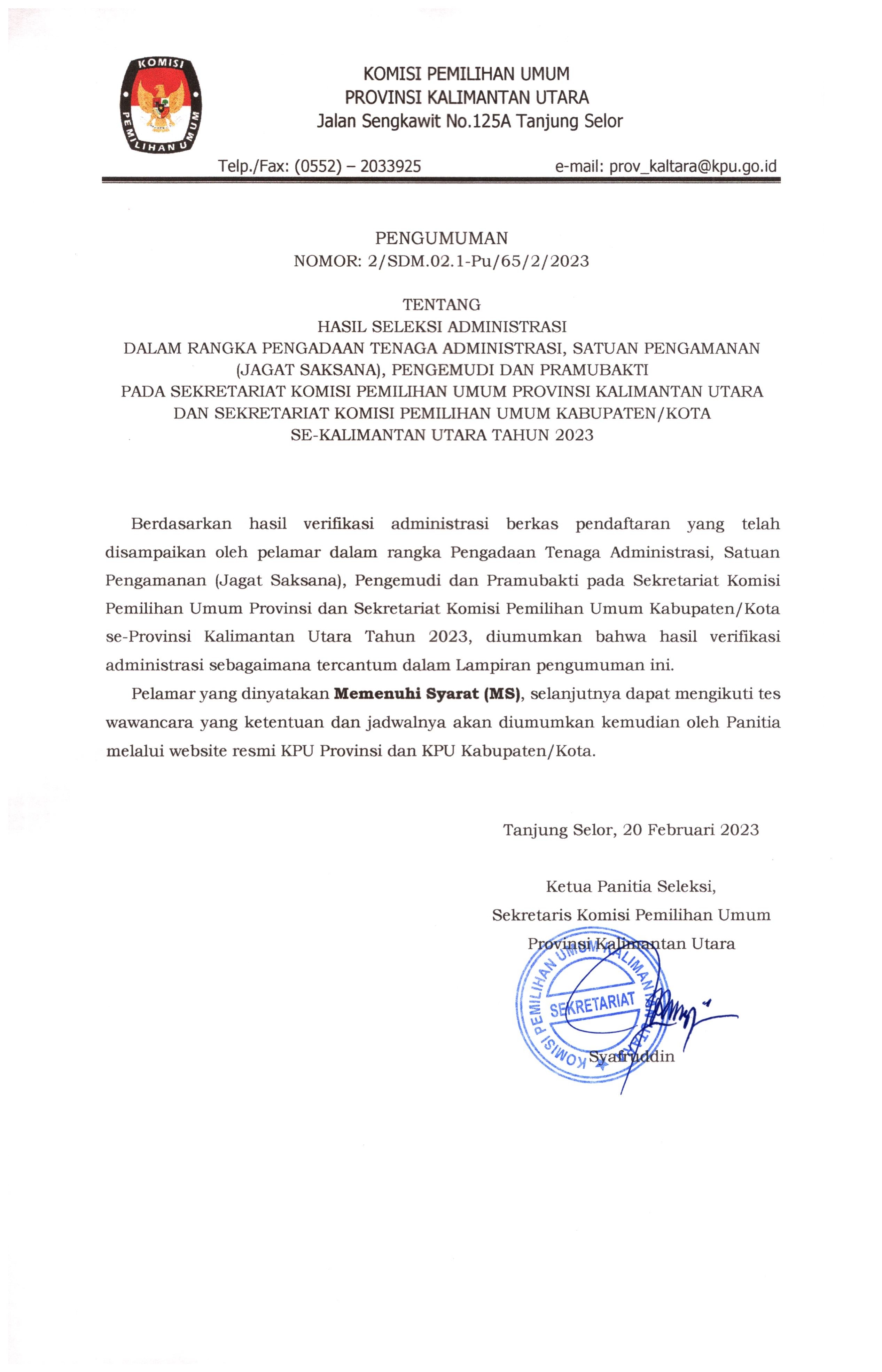PENGUMUMAN HASIL SELEKSI ADMINISTRASI DALAM RANGKA PENGADAAN TENAGA KERJA Selasa, 21 Februari 2023 07:00 420 DOWNLOAD Pengumuman Hasil Administrasi Seleksi 2023.pdf Baca Selengkapnya