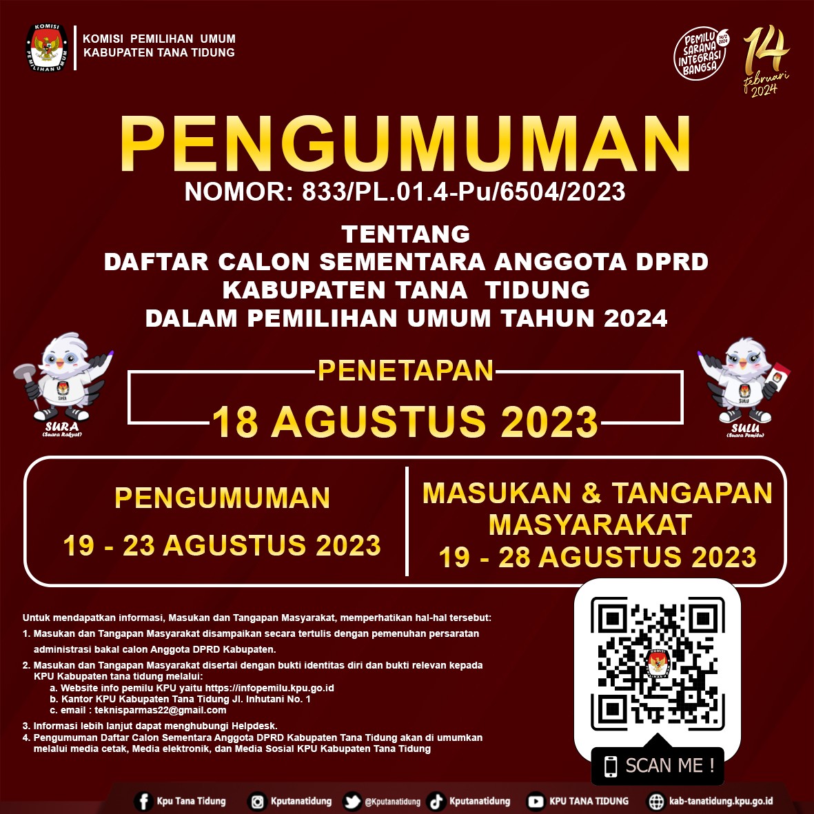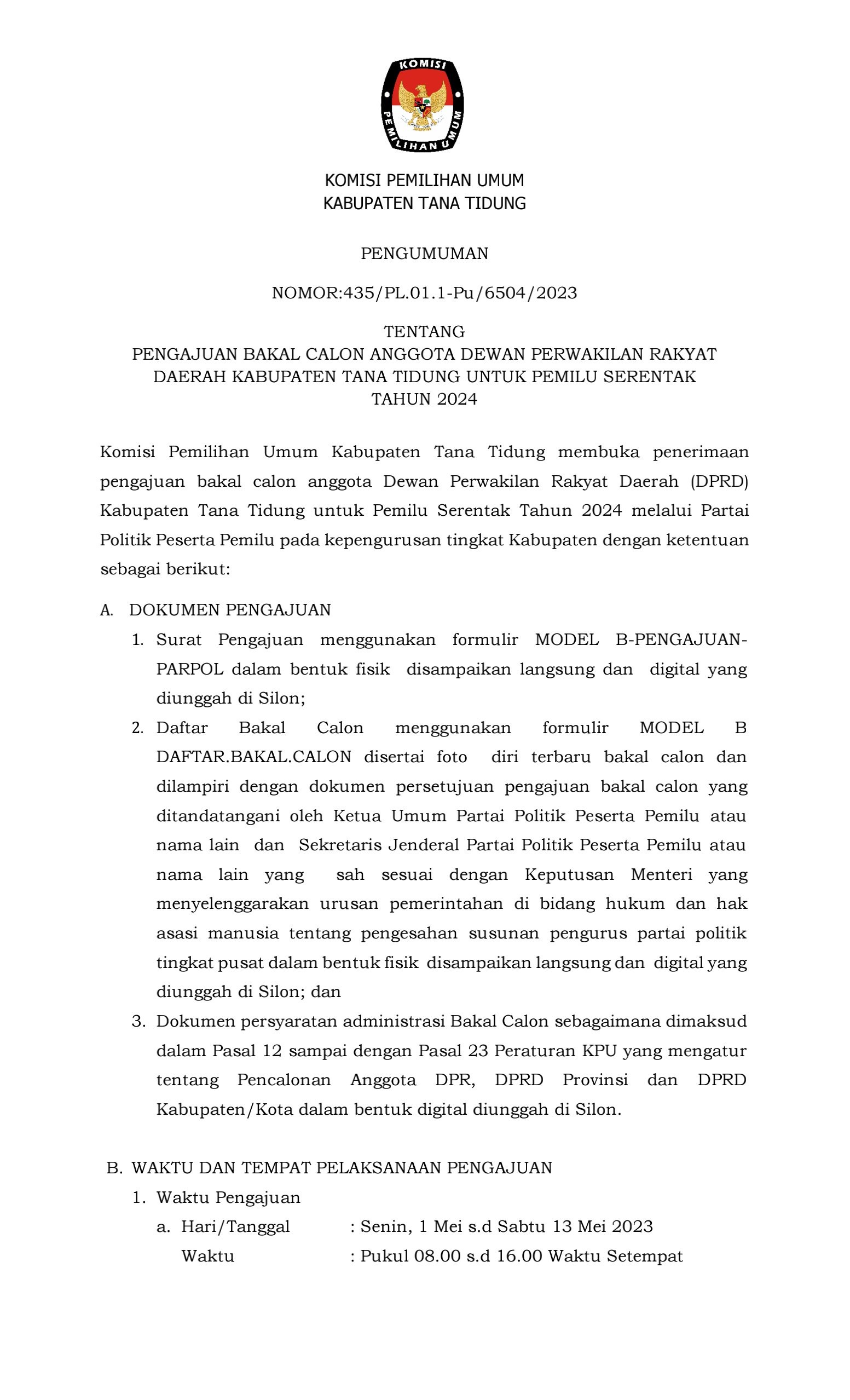 KPU Kabupaten Tana Tidung membuka penerimaan pengajuan bakal calon anggota DPRD Kabupaten Tana Tidung untuk Pemilu 2024 Senin, 24 April 2023 07:00 516 UNDUH PENGUMUMAN PENCALONAN PILEG 2024 FIX.pdf Baca Selengkapnya
