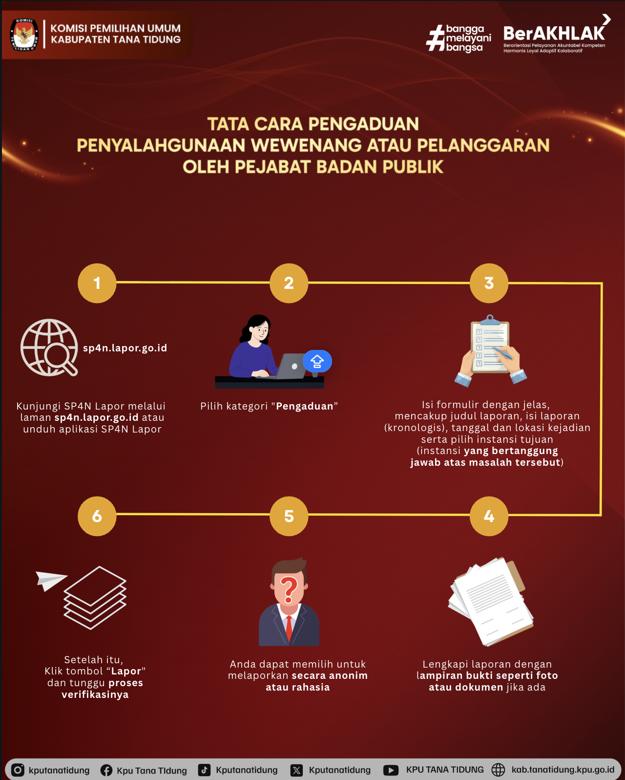 Komisi Pemilihan Umum Kabupaten Tana Tidung berkomitmen dalam menjalankan Zona Integritas Menuju Wilayah Bebas Korupsi (WBK) dan Wilayah Birokrasi Bersih Melayani (WBBM) dengan menerapkan pengaduan masyarakat melalui Aplikasi Sistem Pengelolaan Pengaduan Pelayanan Publik Nasional menggunakan aplikasi LAPOR!